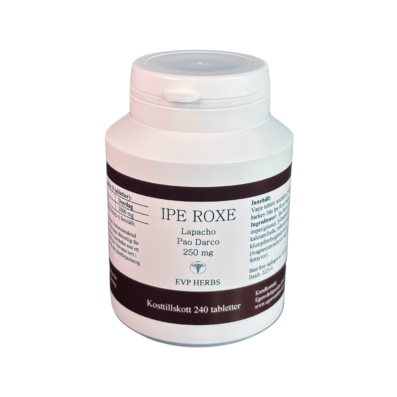 Produktinformation: 240 tabletter. Varje tablett ger 250 mg finmalen innerbark från det sydamerikanska trädet La Pacho. Ipe Roxo 1:1 är ett kosttillskott. Rekommenderad dos bör ej överskridas. Förvaras oåtkomligt för barn. Kosttillskott bör ej användas som ett alternativ till en varierad kost.